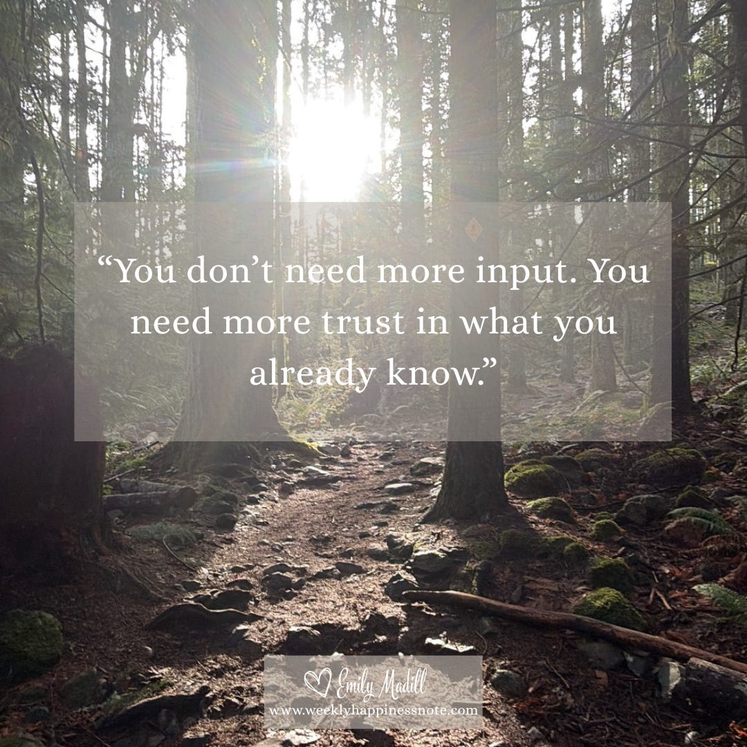 When life gets loud, it’s easy to lose your footing. We look outward for answers, reassurance, and confirmation, forgetting that we already carry an inner guide we can trust. This week’s Happiness Note is a grounded reminder that clarity doesn’t come from more input, but from returning to yourself. Inside, you’ll find simple practices to quiet the noise, observe what’s really happening within you, and rebuild trust in the wisdom you already have.