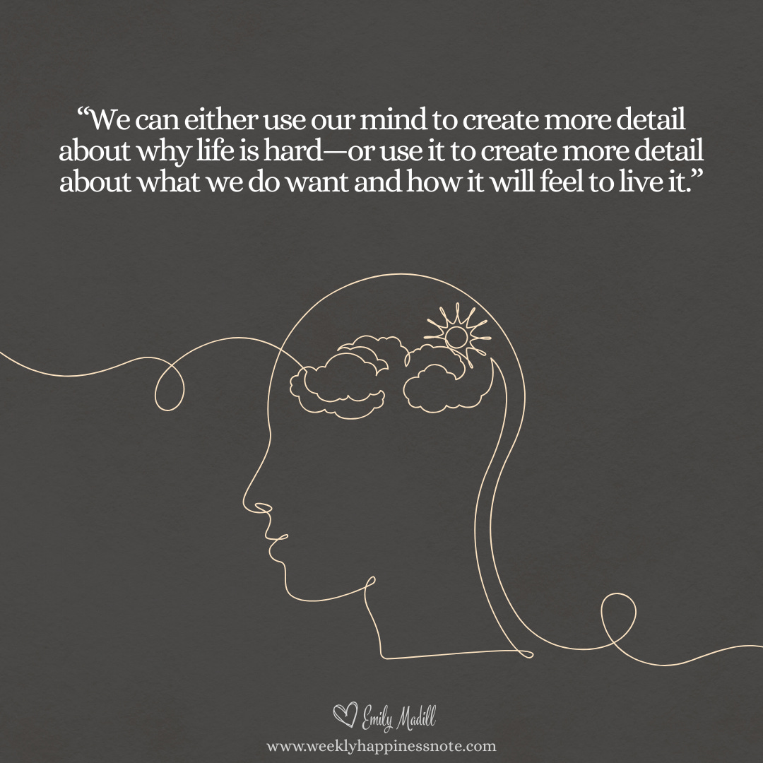 “We can either use our mind to create more detail about why life is hard—or use it to create more detail about what we do want and how it will feel to live it.”